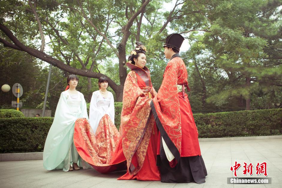 近年来,钟爱汉式婚礼模式的年轻人和家族越来越多。据京城专业运作汉式婚礼的创始人汉衣坊主介绍,汉式婚礼即汉民族的传统婚礼,历经多个历史朝代的积蕴,具有丰富的文化内涵。图为2013年9月28日,在北京 福源花园举办的汉式婚礼。中新社发 王超 摄