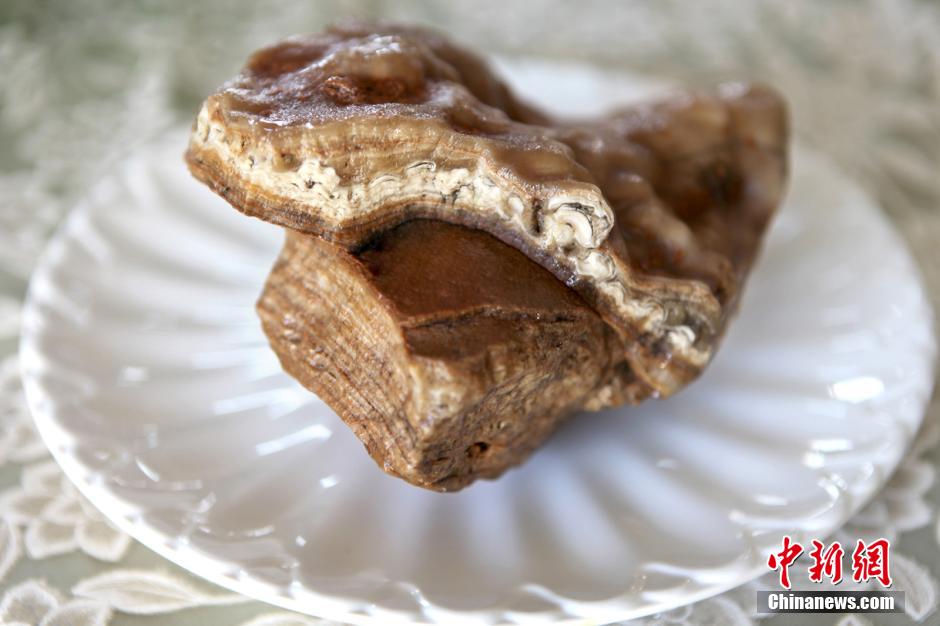 12月11日,河南省新密市国土资源局职工陈昱仲,用收集到的20多块“肉石”摆出了一桌丰盛的“肉石宴”。在20多块形态各异的“肉石”中,有的似猪酮体的五花肉,有的像红烧肉,一块块精美、逼真,有些“肉石”还可以明显看出肉皮、肥肉、瘦肉、软骨相间等部分,简直能够以假乱真,如果你不用手摸一摸,很难分辨出它竟是大自然形成的石头。据悉,“肉石”系天然石种,多数属沉积岩,硅置岩或变质岩,是在地质运动过程中与其他矿物质接触色化而成。“肉石”珍贵贵在有皮,世间红白相间的石头比较多,但要有皮才算“肉石”中的上品。图为几可乱真的“肉石”。梁冠山 摄