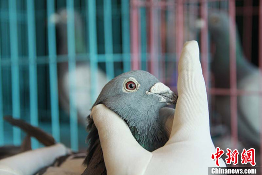 评委在察看一羽信鸽的眼睛。曹新加 摄