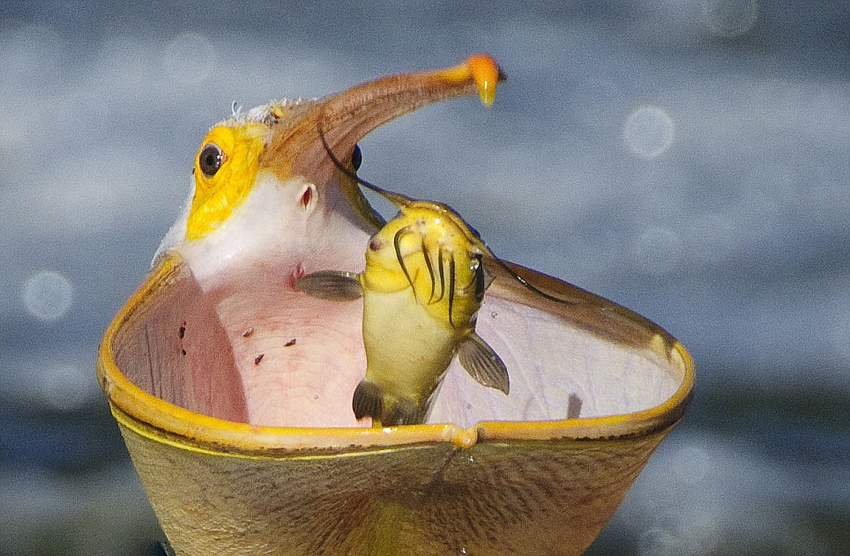 59岁的约翰是一名软件工程师,当日,他碰巧目睹并拍摄了这一幕。鱼儿们游过大坝之后受惊跳起,使得鹈鹕捕食更为方便。鹈鹕将这条鲶鱼反复抛起,直到其以合适的姿势落入嘴中。鹈鹕不是用喉囊储存鱼,而是立即把鱼吞下。而鹈鹕喂养幼雏时,幼雏将嘴伸进亲鸟的食道取食父母回吐的食物。