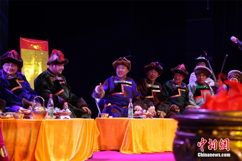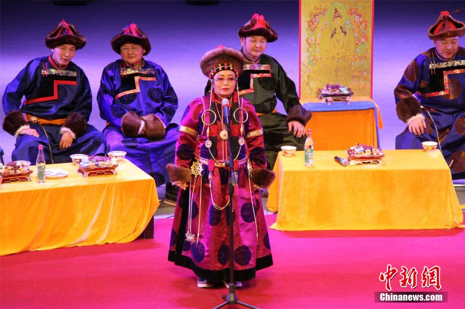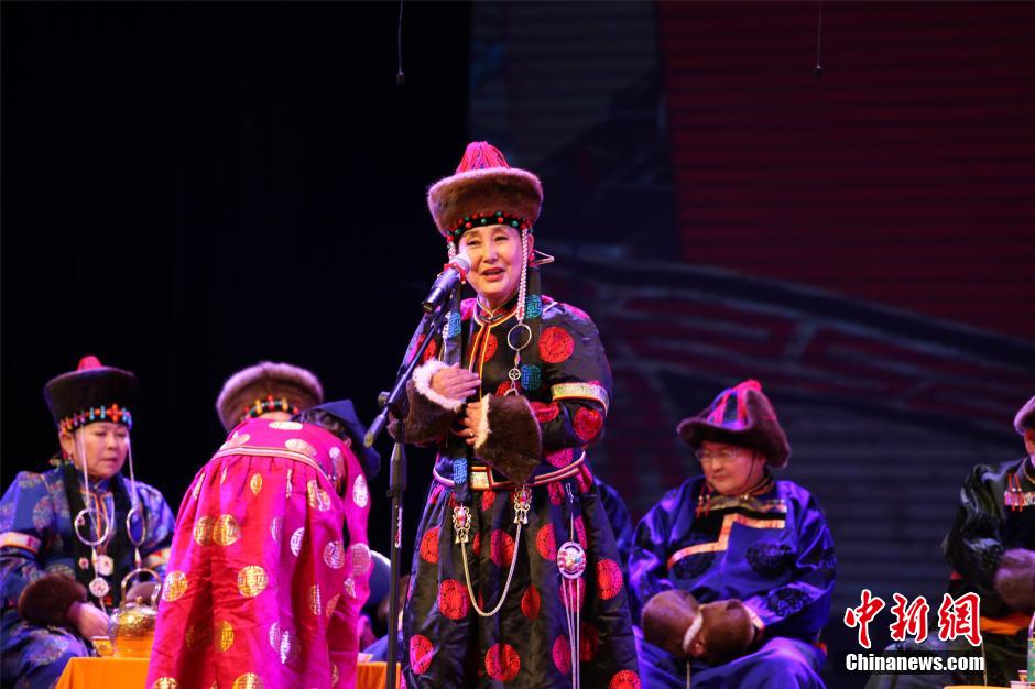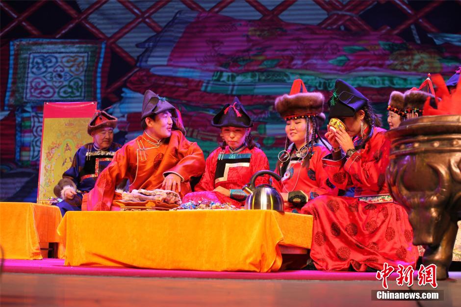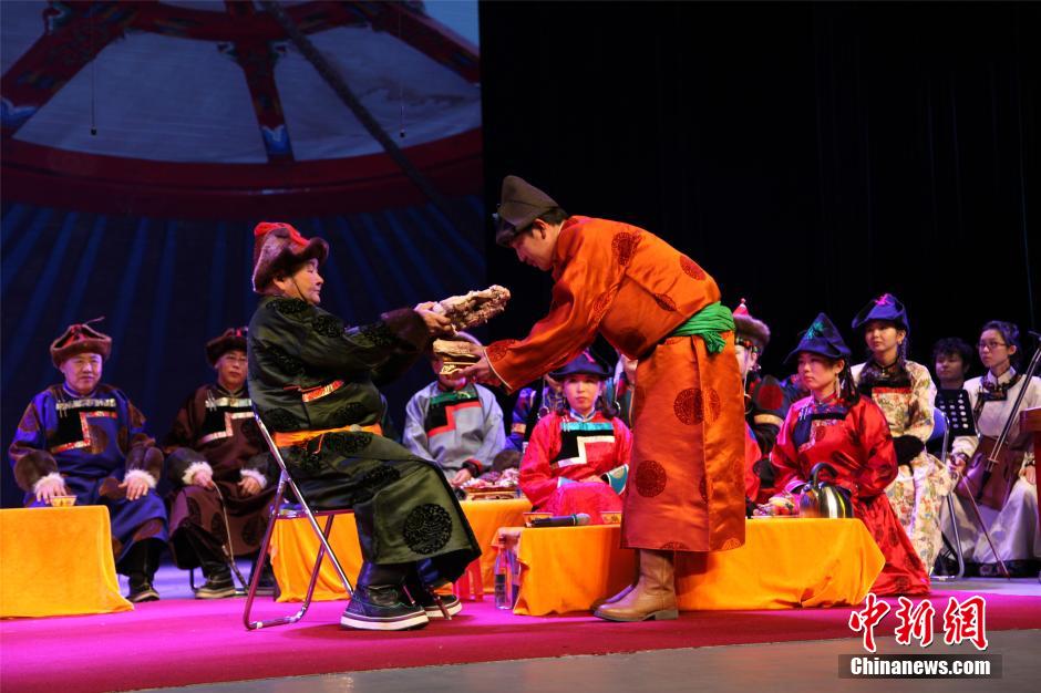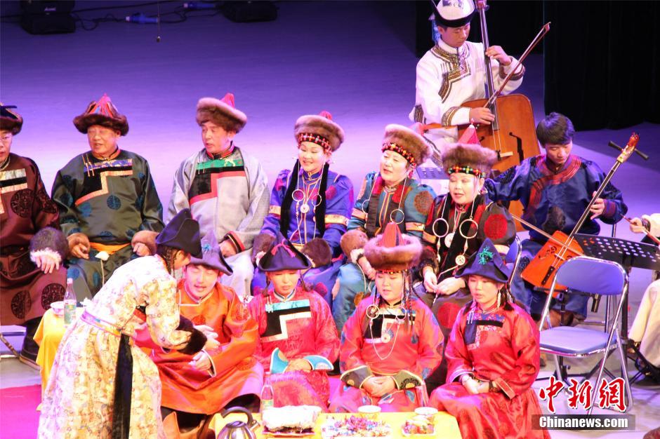 12月18日晚,大型民族传统音乐活动——“蒙古族布里亚特部、鄂温克族使鹿部传统歌舞展示会”在内蒙古大学艺术学院举办,展示了传统布里亚特婚礼的送亲仪式。来自蒙古族布里亚特部的表演者们身着节日盛装、载歌载舞,为大家再现当时的场景。蒙古族布里亚特部曾为成击思汗的属部,16世纪后开始在额尔古纳河、贝加尔湖、色楞格河流域一带草原上游牧,中国境内的布里亚特蒙古人约有7000余人。中新社发 夏志刚 摄