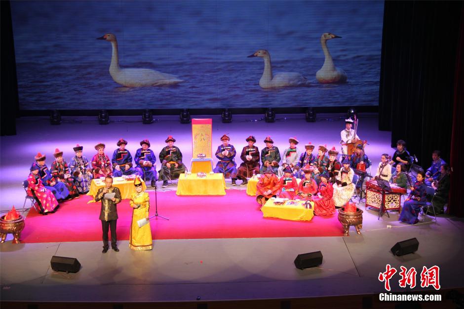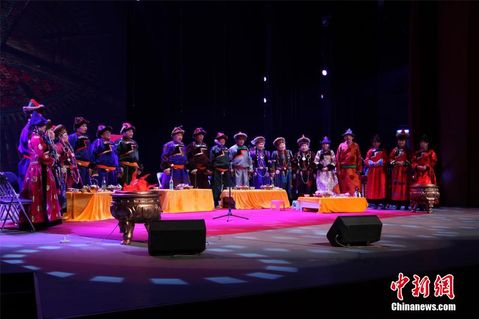 12月18日晚,大型民族传统音乐活动——“蒙古族布里亚特部、鄂温克族使鹿部传统歌舞展示会”在内蒙古大学艺术学院举办,展示了传统布里亚特婚礼的送亲仪式。中新社发 孙涛 摄