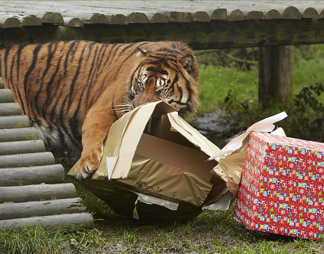 照片中,16个月大的西伯利亚虎“阿里纳”在礼品盒里发现了它的圣诞礼物——船的碰垫,它嘴、脚并用拆开了礼盒,现在正与新玩具玩得不亦乐乎。而成年的苏门答腊虎“埃米尔”(Amir)被一个颜色亮丽的礼品盒所吸引,盒子里面装着很多肉。