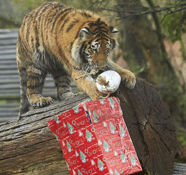 照片中,16个月大的西伯利亚虎“阿里纳”在礼品盒里发现了它的圣诞礼物——船的碰垫,它嘴、脚并用拆开了礼盒,现在正与新玩具玩得不亦乐乎。而成年的苏门答腊虎“埃米尔”(Amir)被一个颜色亮丽的礼品盒所吸引,盒子里面装着很多肉。