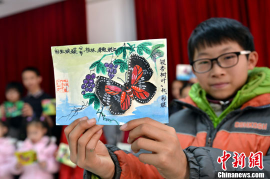 12月22日,苏州小朋友在凋落的银杏叶子上画蝴蝶,赋予了树叶新的生命,借此提倡环保。图为小朋友展示完成的银杏叶“化”彩蝶作品。中新社发 王思哲 摄