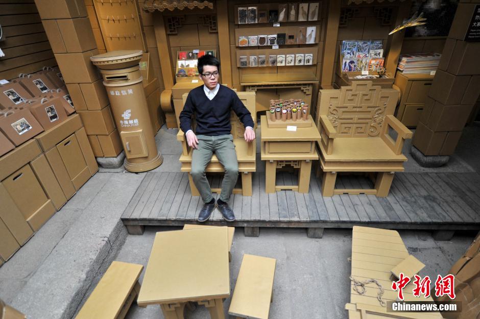 12月23日,福建首家台湾纸箱王创意园落户福州三坊七巷,创意园里结合了福州三坊七巷各个景点,打造一个梦幻的纸世界。图为民众体验纸制桌子,可承受300斤重力。吕明 摄