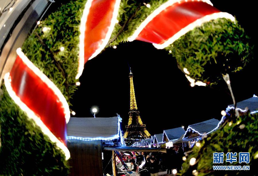 12月23日,人们在法国巴黎埃菲尔铁塔前的夜市上购物。近日,巴黎各主要旅游景点和街道张灯结彩,迎接圣诞和新年的到来。 新华社记者陈晓伟摄