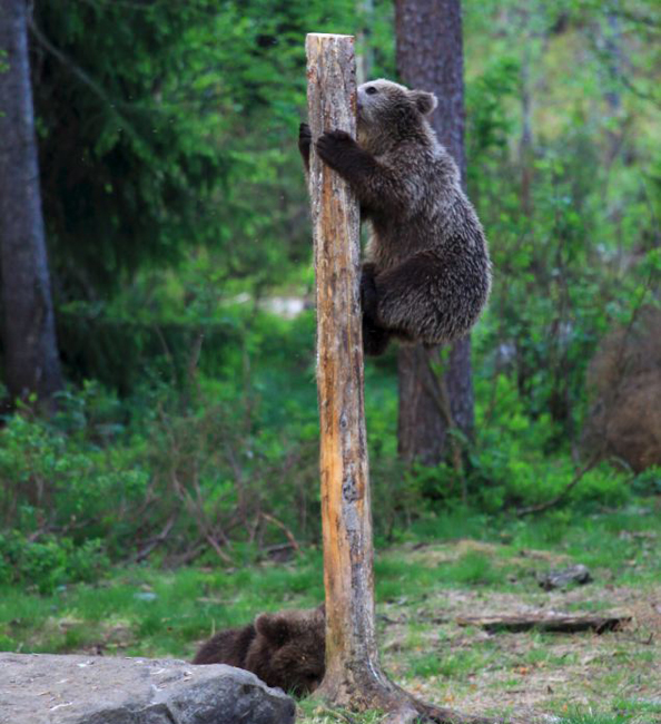 今年52岁的芬兰摄影爱好者Valtteri Mulkahainen在森林中偶然拍到了熊妈妈教宝宝爬树的场景。在一根3米高的树干旁,熊妈妈先估计了一下树干的高度,然后两只小熊开始抓住树干奋力攀爬,最后都到达了没有叶子的树干顶端。“它们反复尝试着爬树,熊妈妈会时不时为孩子们示范一下适宜的动作。”Valtteri说,“而且熊妈妈一家似乎对这棵单独的树“情有独钟”,它们对森林中的其他树似乎没有这么感兴趣。”