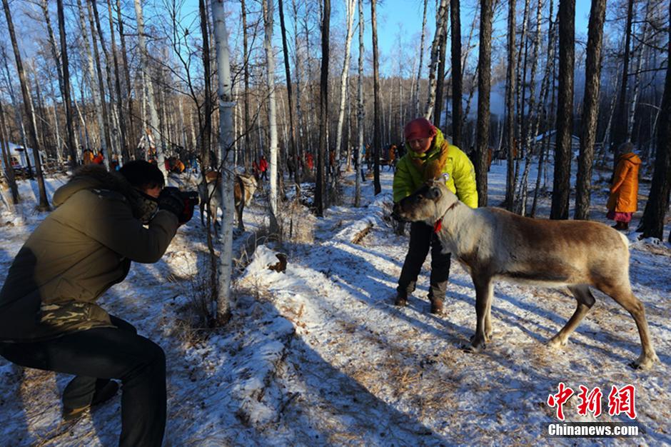 12月25日,全国各地的数百名游客来到内蒙古呼伦贝尔根河市的敖鲁古雅鄂温克布冬霞猎民点体验纯正的鄂温克民俗:游客们可以吃特色鹿肉串、列巴、蓝梅果子酱,喝猎民自已泡制的白酒,与驯鹿亲密接触,体验森林民族敖鲁古雅鄂温克的纯净生活。尚军 摄