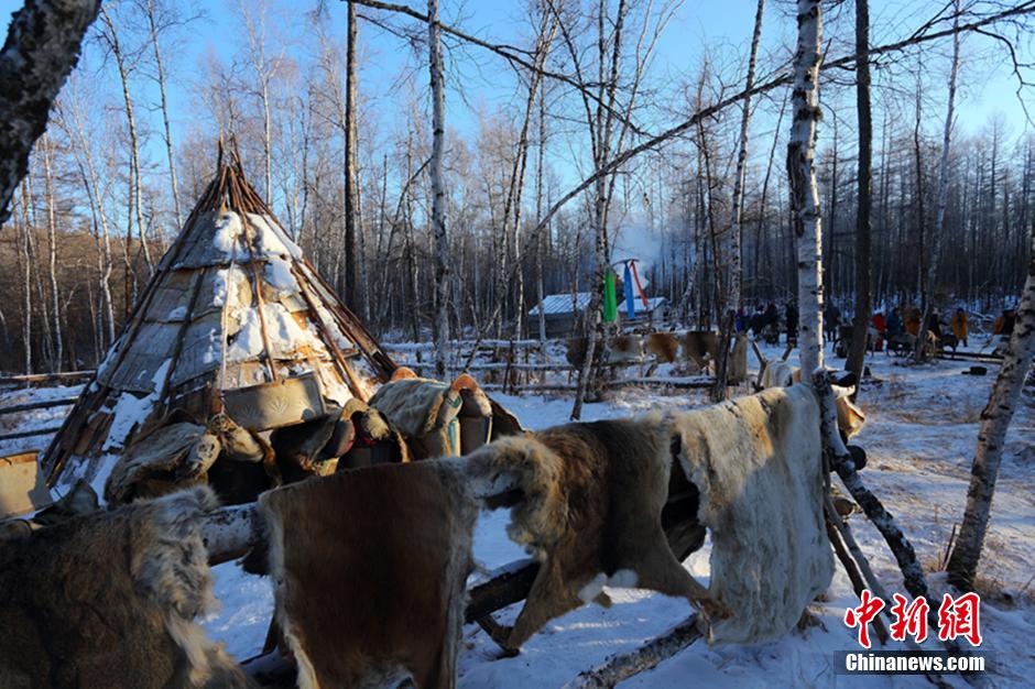 12月25日,全国各地的数百名游客来到内蒙古呼伦贝尔根河市的敖鲁古雅鄂温克布冬霞猎民点体验纯正的鄂温克民俗:游客们可以吃特色鹿肉串、列巴、蓝梅果子酱,喝猎民自已泡制的白酒,与驯鹿亲密接触,体验森林民族敖鲁古雅鄂温克的纯净生活。尚军 摄