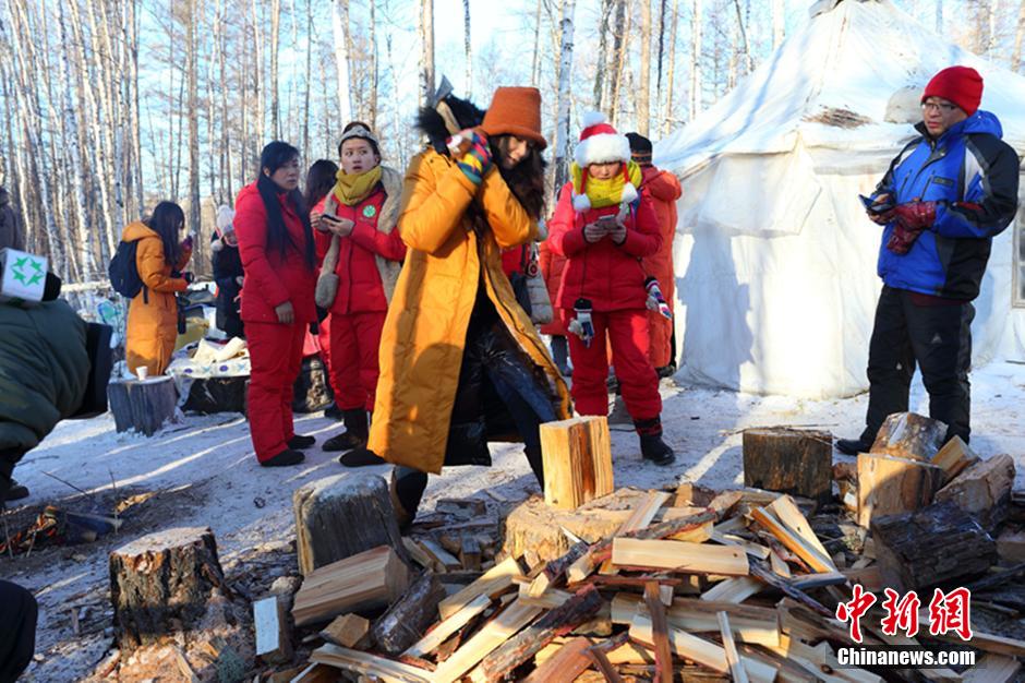 12月25日,全国各地的数百名游客来到内蒙古呼伦贝尔根河市的敖鲁古雅鄂温克布冬霞猎民点体验纯正的鄂温克民俗:游客们可以吃特色鹿肉串、列巴、蓝梅果子酱,喝猎民自已泡制的白酒,与驯鹿亲密接触,体验森林民族敖鲁古雅鄂温克的纯净生活。尚军 摄
