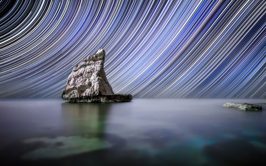 英国《每日电讯报》报道,在亚得里亚海海岸,46岁的意大利摄影师马里兹奥·皮格诺蒂冒着严寒拍摄了一组精彩的长曝光摄影作品,展现点点星 辰在水晶般清澈的夜空中形成的绚美夺目的漩涡状轨迹。