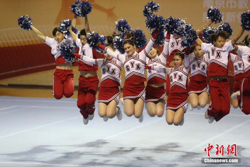 12月29日,参赛选手进行啦啦操的比赛。当日,“第二届全国中学生健美操、啦啦操锦标赛”在南京师范大学仙林校区体育馆内举行,来自全国各地的近千名参赛选手同台竞技健美操和啦啦操,一展各自风采。中新社发 泱波 摄