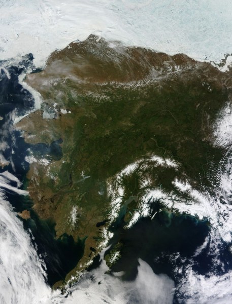 美国宇航局的陆地卫星6月17日拍摄的照片,展示了罕见的阿拉斯加无云景象。通常情况下,阿拉斯加大部分地区或者部分地区被云层覆盖。
