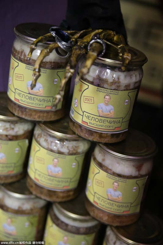 当地时间2013年12月21日,俄罗斯圣彼得堡,涅夫斯基大街上的死亡博物馆,装在罐子里的人肉。