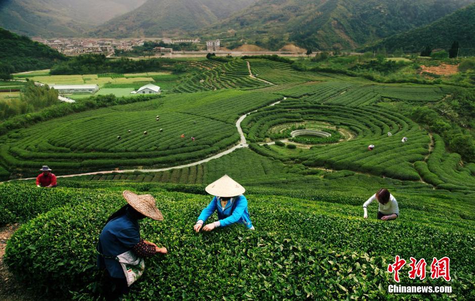 美丽千岛湖新十景之春山玉叶。图为茶农正在采摘茶叶。中新社发 王建才 摄