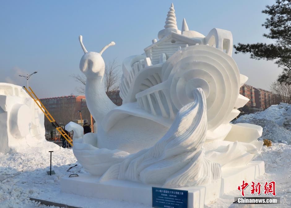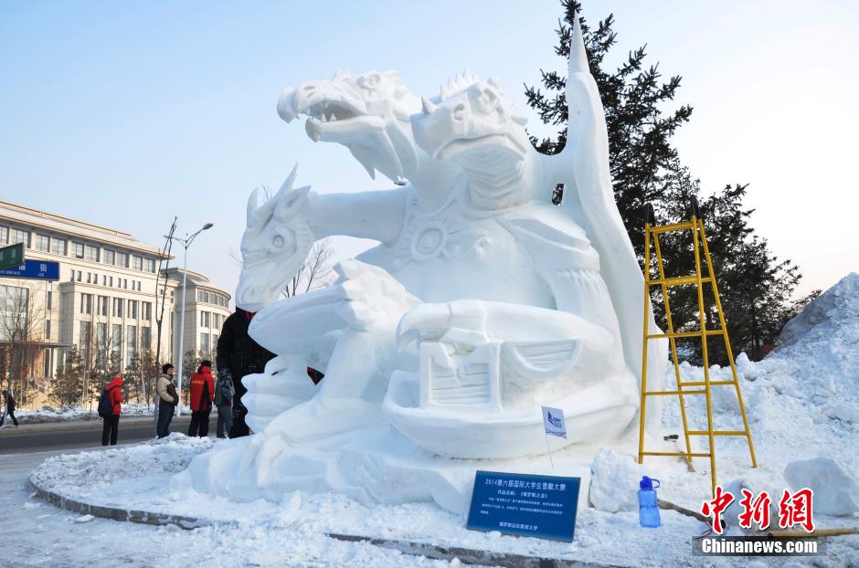 1月7日,第六届国际大学生雪雕比赛在哈尔滨工程大学闭幕。来自中国、俄罗斯、英国、日本、韩国、朝鲜、泰国、马来西亚、丹麦、台湾、香港11个国家和地区的61所高校的大学生们在这里展示了他们的作品。图为俄罗斯远东联邦大学《俄罗斯之龙》获得本次比赛特等奖。中新社发 胡迪 摄