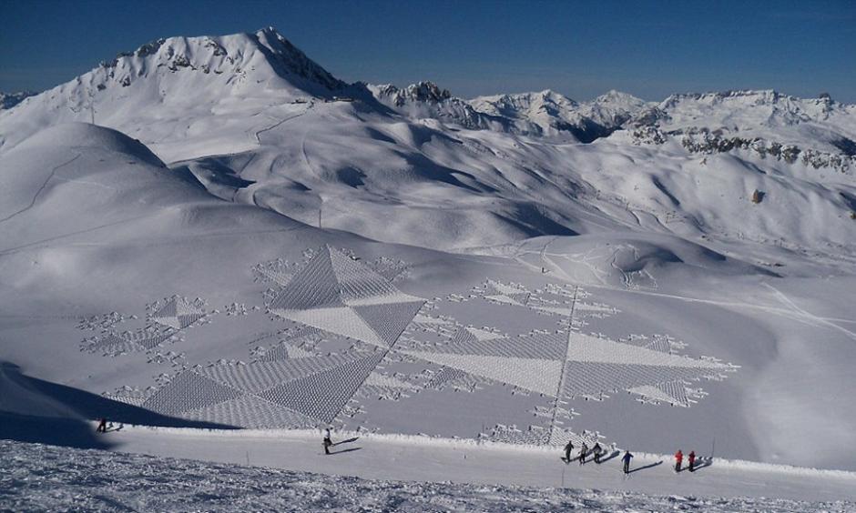 一个指南针、一双雪地靴,便是他创作的全部工具。他一遍遍地在新雪上行走,创造出斜坡雪地上的独特美景。因雪还在不断飘落,这些美丽的作品不久便会被覆盖,仅能维持一天。