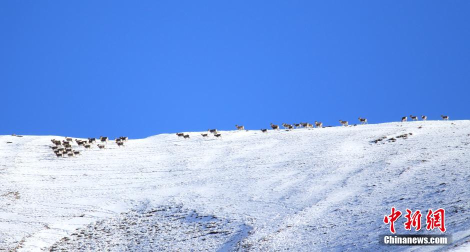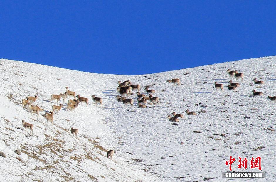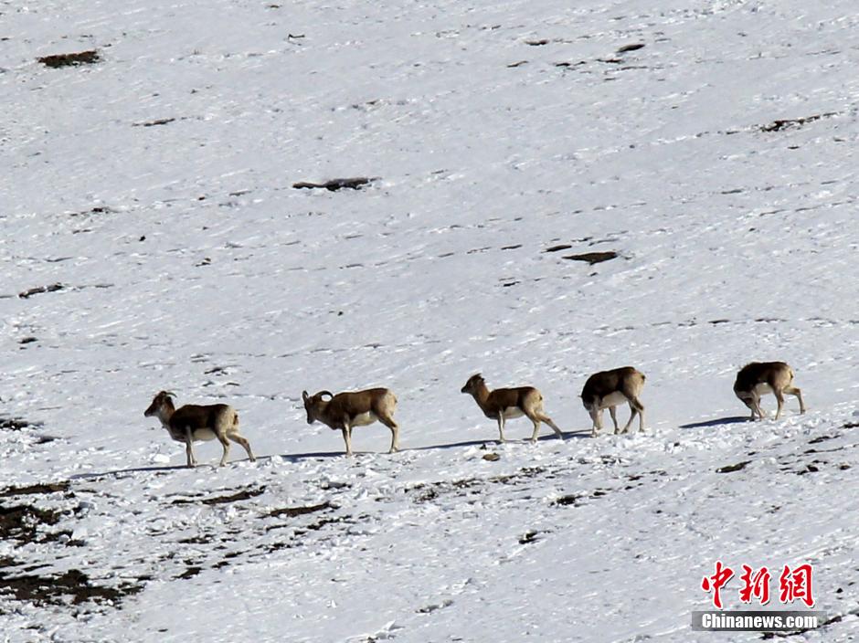 1月10日中午,60余只野生盘羊在山间集体觅食,场面十分壮观。据悉,大规模野生盘羊集体觅食,近年来在中国很少见。盘羊别名大头羊、大角羊,善于爬山,比较耐寒,主要分布于新疆、青海、甘肃、西藏、四川、内蒙古等地,属国家二级保护动物。中新社发 志君 摄 图片来源:CNSPHOTO