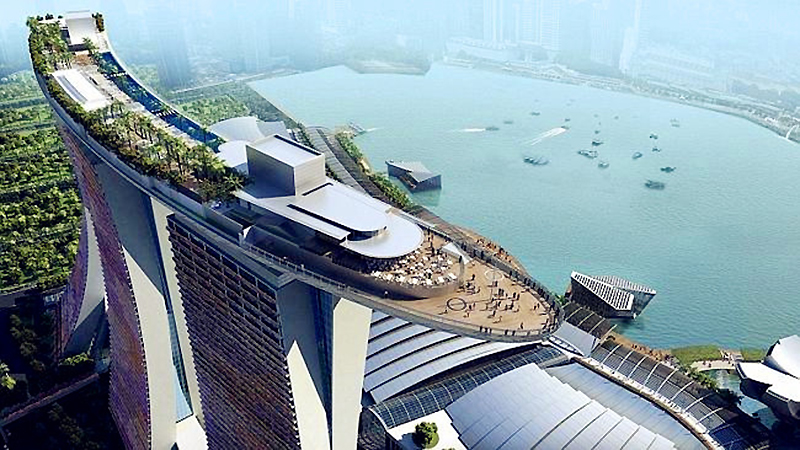 滨海湾金沙酒店是一家耗资50亿美元的综合度假胜地,共有55层,楼顶上还建有一个巨大的泳池。此外还有一条室内运河、一座形似莲花的博物馆、商店、餐馆、剧院、博物馆和赌场。这一设计被一些人描述为由类似顶部设有一个下行甲板的三个板球桩组合而成。