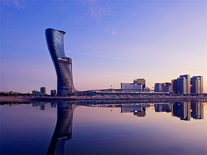 迪拜的邻居——阿布扎比也有一些有趣的建筑结构,首都门便是其中之一。它是阿布扎比最高的建筑之一,拥有众所周知的打破纪录了的向西18度倾斜角,其倾斜度甚至过于著名的比萨斜塔。该建筑一共35层,包括189间客房,其中有22个套间,此外还有一个室外游泳池和健身中心。除了作为酒店之外,它还是阿布扎比国家展览中心最为引人注目的一处,以及是中东最大的会议和活动中心。