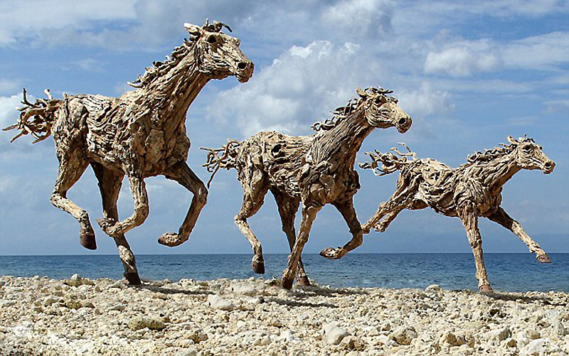 2014年中国农历新年将至,全球友人纷纷向即将到来的中国农历骏马之年献礼。据英国《每日邮报》1月15日报道,英国伯明翰能工巧匠詹姆士?多兰?韦伯(James Doran-Webb)利用从海滩上捡拾的漂浮木,耗时6个月,制造出三匹形象逼真的骏马木雕。