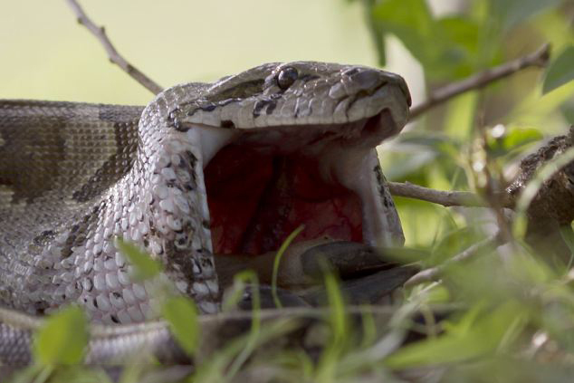 据悉,该个场景是在博茨瓦纳莫瑞米野生动物保护区拍摄的。这条身长8英尺(约合2.4米)的巨蟒之所以能够吞下这只庞大的猎物,关键是它的下颌能够分离,同时利用全身可以无限拉伸的肌腱、肌肉和韧带。一般情况,巨蟒攻击猎物,首先就是用身体裹住猎物,再调动全身强劲的肌肉制服猎物。