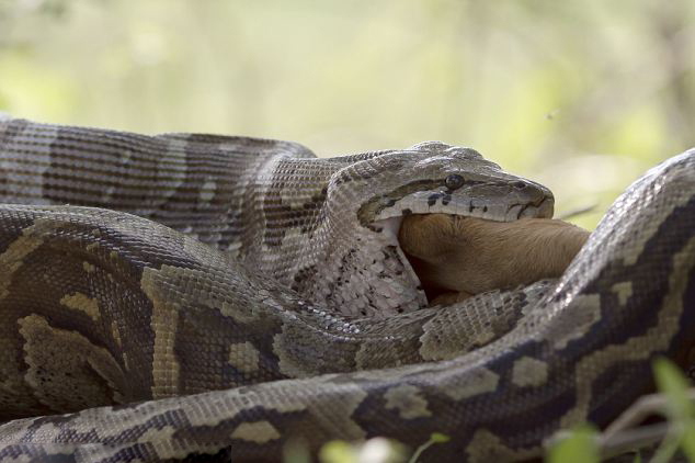 据悉,该个场景是在博茨瓦纳莫瑞米野生动物保护区拍摄的。这条身长8英尺(约合2.4米)的巨蟒之所以能够吞下这只庞大的猎物,关键是它的下颌能够分离,同时利用全身可以无限拉伸的肌腱、肌肉和韧带。一般情况,巨蟒攻击猎物,首先就是用身体裹住猎物,再调动全身强劲的肌肉制服猎物。