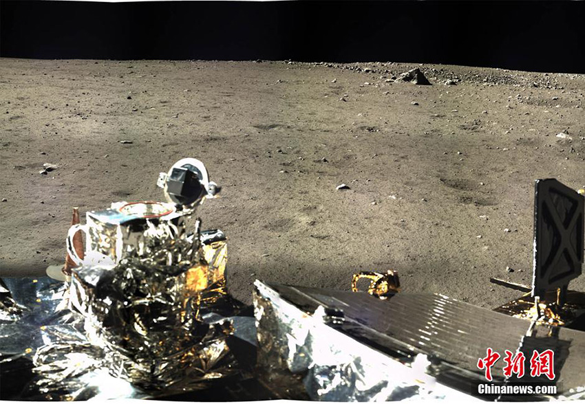 1月17日,中国国家国防科技工业局发布嫦娥三号着陆器拍摄的月球影像图。图为2013年12月17日至18日,嫦娥三号着陆器地形地貌相机拍摄的着陆器周边360°范围的全景镶嵌影像图,采用圆柱投影方式表达。中新社发
