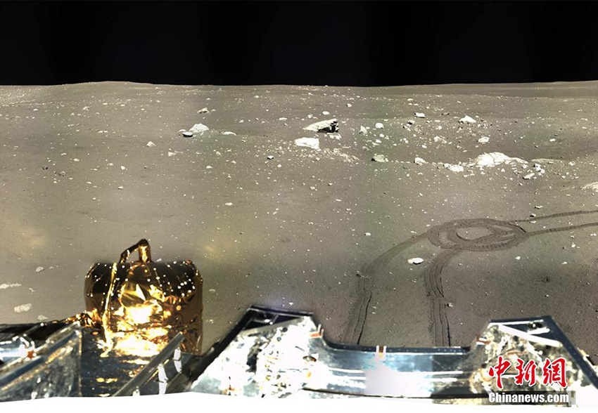 1月17日,中国国家国防科技工业局发布嫦娥三号着陆器拍摄的月球影像图。图为2013年12月17日至18日,嫦娥三号着陆器地形地貌相机拍摄的着陆器周边360°范围的全景镶嵌影像图,采用圆柱投影方式表达。中新社发