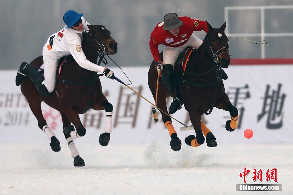 1月19日,英格兰队(白色队服)与中国香港队(红色队服)奋勇争球。当天,2014富国高银雪地马球世界杯赛总决赛中,历经四节激烈角逐,英格兰队最终以6-5力克中国香港队,成为这场巅峰对决的赢家。中新社发 佟郁 摄