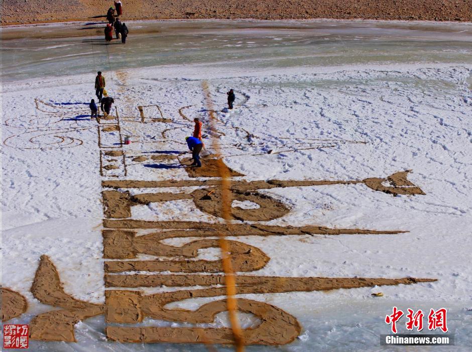 玉树藏族民众通天河冰面书写巨型“六字真言”