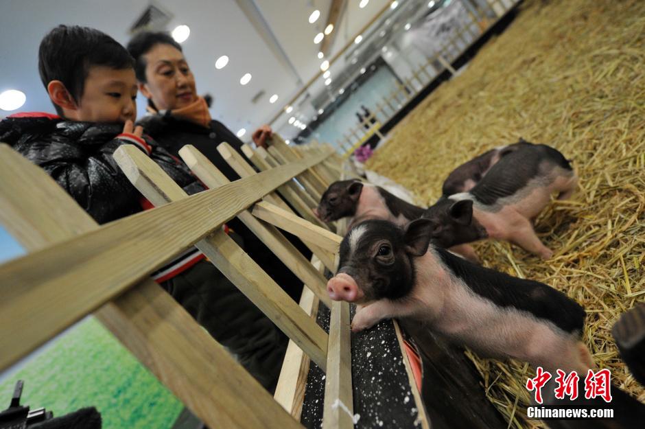 1月21日,山西太原一家大型商场开辟了“原生态猪圈”,民众可近距离观赏六只可爱的泰国小香猪。临近春节购物消费旺季,中国实体商场在与电商的竞争中别出心裁,通过各种方式来吸引消费者的关注。中新社发 韦亮 摄