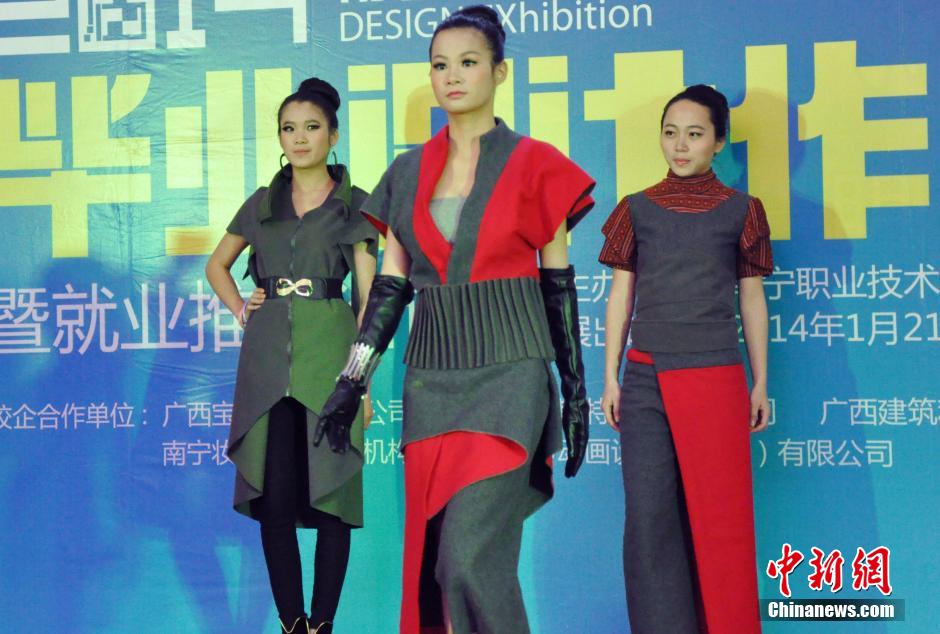 1月21日,南宁职业技术学院服装设计专业大学生模特展示毕业作品。当日,该校艺术工程学院2014届毕业设计作品展暨毕业生就业推荐洽谈会活动在广西南宁举行,吸引大批企业现场争抢人才,洽谈合作项目。图为创意服装秀现场。中新社发 黄艳梅 摄