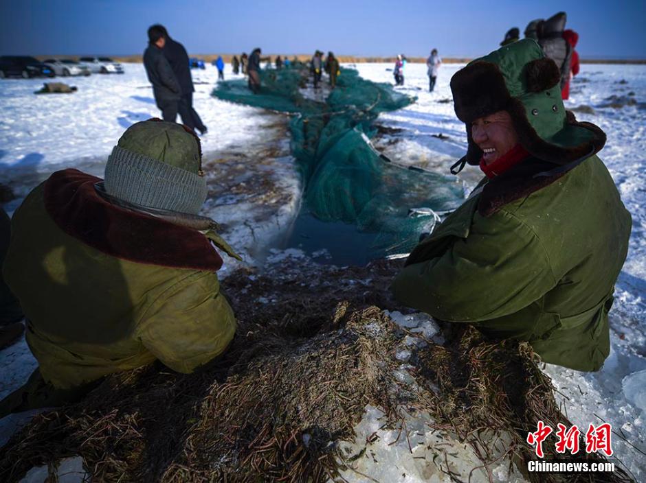 趁着渔工整理渔网的空,鱼把头坐在冰堆上小息,脸上的笑容似乎表示,这一网的收获已信心满满。刘新 摄