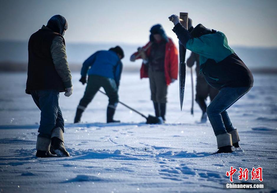 渔工两人一组,在冰面上每隔15至20米,凿一个小冰眼供冰下走网,然后下网、穿杆、行网。刘新 摄