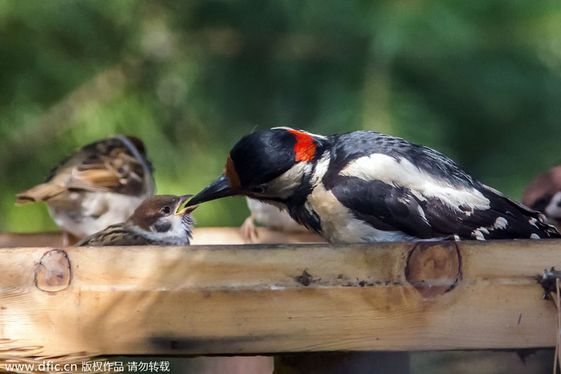 2014年1月22日报道,这组照片展示了一只大方的啄木鸟妈妈把食物分给麻雀宝宝的有爱一幕。俄罗斯圣彼得堡40岁的摄影师Ekaterina Lashkova在自家后院里拍到啄木鸟和麻雀妈妈并排在给自己的孩子喂食,后来,麻雀妈妈飞走了,小家伙们害怕地大声叫起来,啄木鸟妈妈觉得自己那边的东西也够吃了,于是转身把食物放到了小麻雀的嘴里。