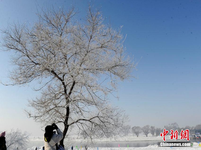 1月22日,吉林市雾凇岛出现雾凇景观,银妆素裹的冰雪世界吸引大批游客登岛观光。张瑶 摄