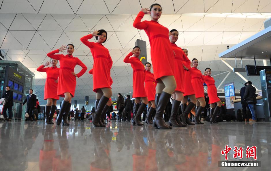 1月23日,机场工作人员在跳“快闪”舞蹈。当日,是中国传统佳节“小年”,沈阳桃仙国际机场当日以“快闪”舞蹈表演为旅客在佳节中带来了喜庆和愉悦。中新社发 于海洋 摄