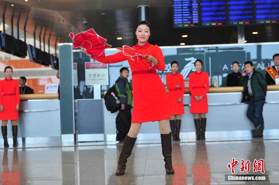1月23日,机场工作人员在跳“快闪”舞蹈。当日,是中国传统佳节“小年”,沈阳桃仙国际机场当日以“快闪”舞蹈表演为旅客在佳节中带来了喜庆和愉悦。中新社发 于海洋 摄