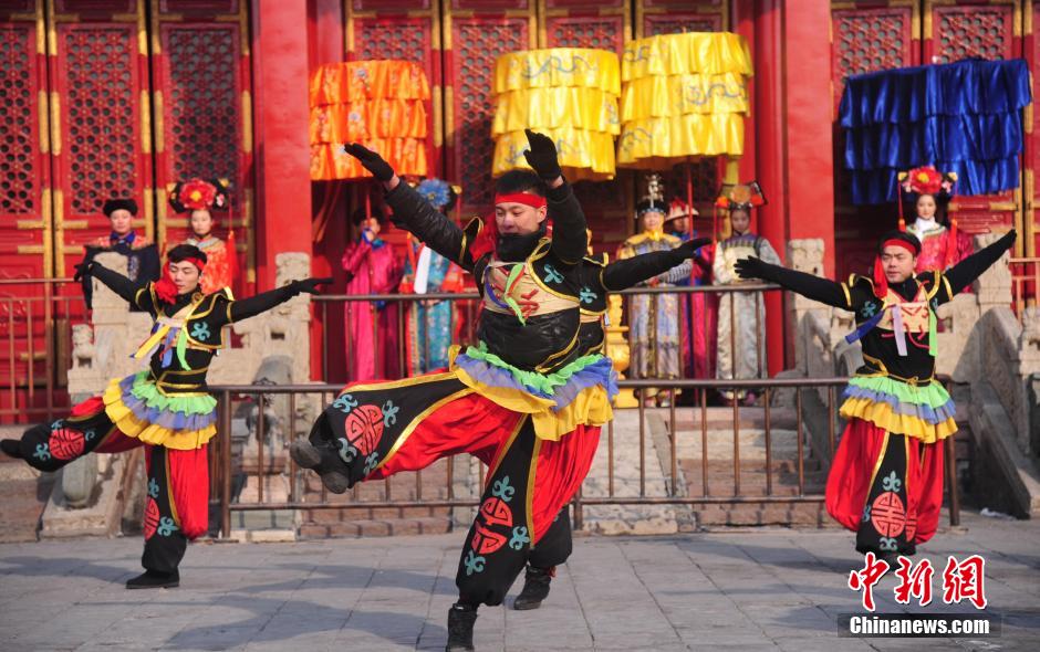 1月23日,宫廷礼仪展演“新春朝贺”在沈阳故宫的崇政殿前广场上演。当日,是腊月二十三,中国传统节日中的“小年”,世界文化遗产沈阳故宫推出宫廷礼仪展演“新春朝贺”。据介绍,这也是2014年春节期间“到沈阳故宫过大年”活动之一。“新春朝贺”演出共16场,还将于正月初一至初六以及正月十五上演。中新社发 于海洋 摄
