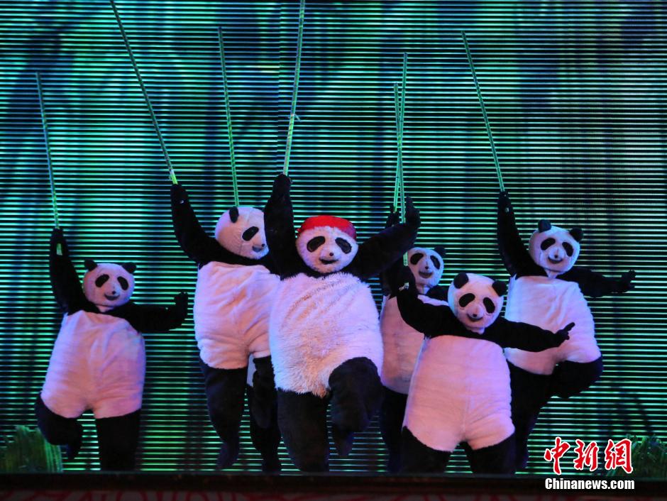 1月24日,北京什刹海剧场上演了一场由众多武术冠军表演的功夫剧《什刹海》。图为“功夫熊猫”表演棍术。中新社发 李慧思 摄