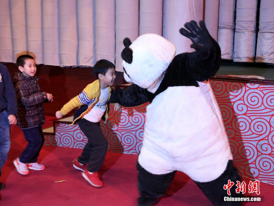 1月24日,北京什刹海剧场内,扮成功夫熊猫的工作人员与一名儿童“比试”武艺。中新社发 李慧思 摄