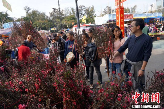 1月25日,香港市民在选购桃花树,准备欢度新春。中新社发 洪少葵 摄