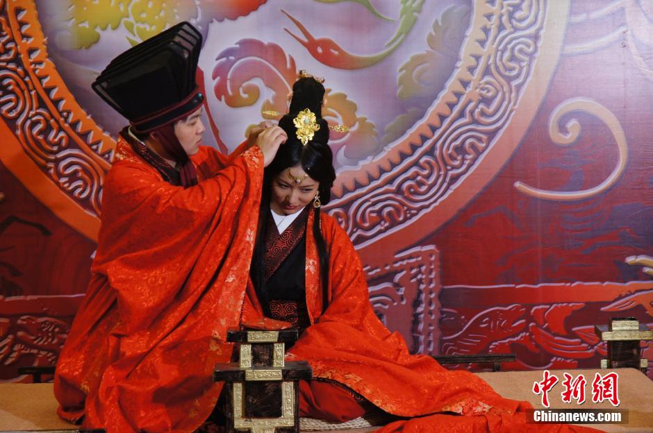 情侣着汉式婚礼服拍摄微电影