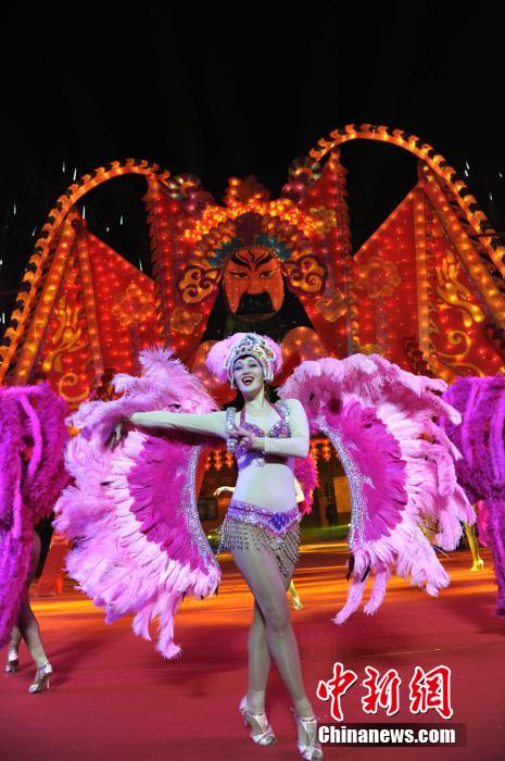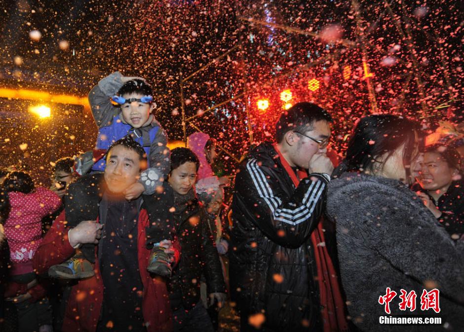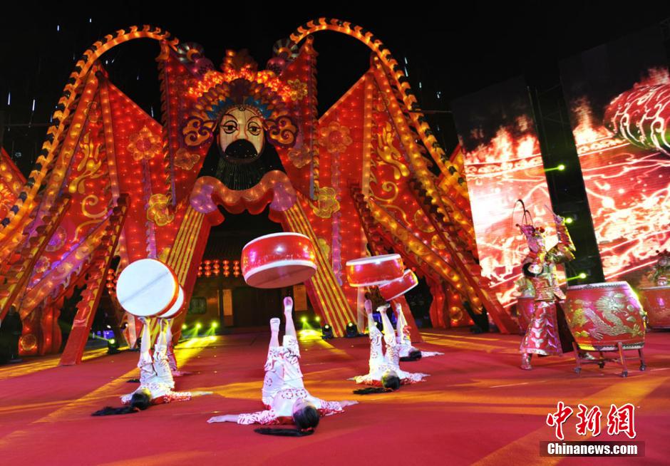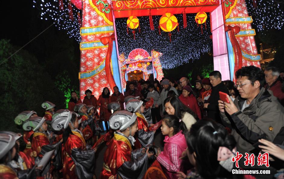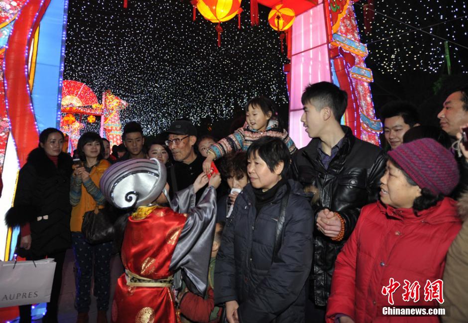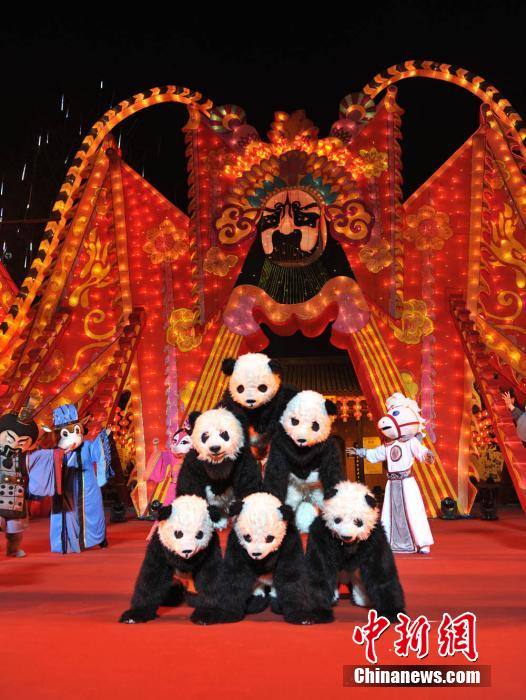 1月28日晚间,“2014成都大庙会”暨甲午游喜神方活动在成都武侯祠博物馆正式开庙!威武的三国鼓阵、梦幻的火舞、可爱的小喜神和Q版三国人物陆续精彩亮相,四组市民家庭与与成都武侯祠博物馆职工代表一同按下大庙会开庙机关,在现场众人的一片欢呼喝彩声中,庙门开启。由此,连续18天的“2014成都大庙会”活动正式拉开帷幕。安源 摄