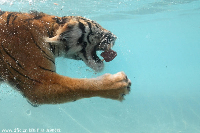 2014年1月29日报道,美国加州,动物园内一头饥饿的老虎跳进水中吃肉,但似乎是太饿了,以至于跳进水中的力道过猛,所以它差点撞到玻璃,当泡泡消失之后,老虎突然意识到自己的处境,拼命拍打自己的爪子,免得头撞玻璃。据悉,让老虎跳进水中抓肉吃是动物园内的观赏项目。