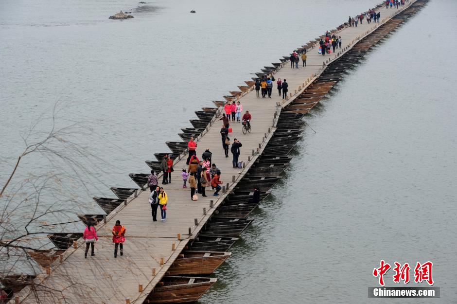 古城墙、古浮桥、古石窟、郁孤台、八镜台、灶儿巷等名胜是江西赣州这座历史文化名城留给后人璀璨的文化遗产。马年春节,中新社记者走进赣州探访,用镜头聚焦古城。图为古浮桥沿用至今。中新社发 陈文 摄