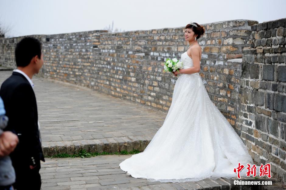 古城墙、古浮桥、古石窟、郁孤台、八镜台、灶儿巷等名胜是江西赣州这座历史文化名城留给后人璀璨的文化遗产。马年春节,中新社记者走进赣州探访,用镜头聚焦古城。图为赣州一对新人在古城墙上拍婚纱照。中新社发 陈文 摄