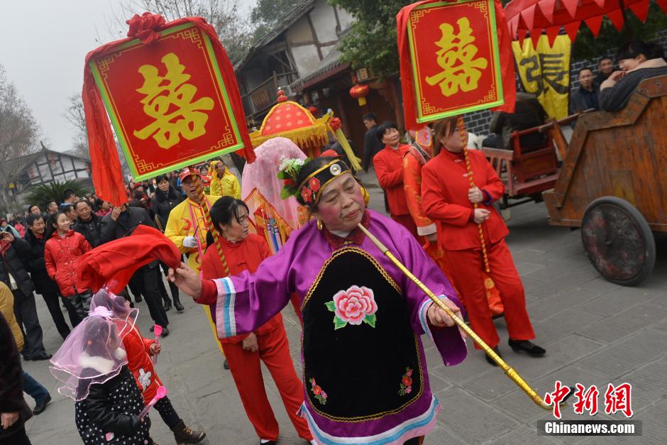 正月初,正逢春节长假期间,四川阆中古城每日上演着川北传统婚俗表演。打扮得花枝招展的媒婆率队迎亲、接亲,一路敲锣打鼓,形形色色的彩礼、大花轿等吸引了八方游客。媒婆率领的迎亲队伍吸引游客。张浪 摄